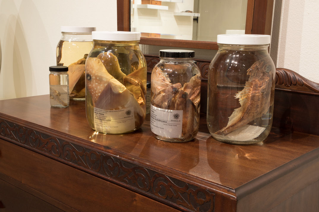 Eleven extinct species are represented here in various ways: sculpturally in specimen jars; as drawings in the Naturalist’s tradition; historically in scientific descriptions linked through QR codes; and obscured by man’s DNA sequences. It is as though we could reconstruct each species with all the information provided, but Rossano complicates this act of mental remediation—his clear glass sculptures submerged in oil are almost imperceptible, and we are only given a clouded glimpse of the portraits of these species. What we can best see is ourselves reflected in the mirrored glass sculpture below the cabinets reminding us that this is our vanity, literally and figuratively.